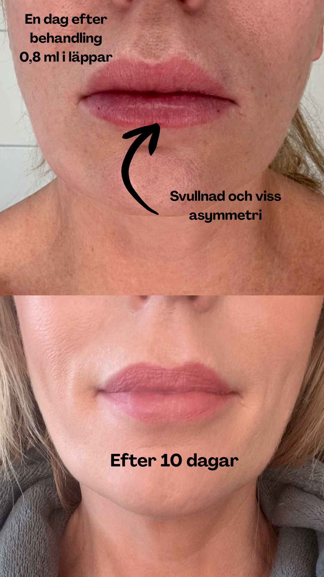 Vid läppbehandling är det extra vanligt att man ser skillnader i svullnad. Läpparna är känsliga och tunna, och minsta skillnad i mängd eller vätskeansamling syns tydligt i början.